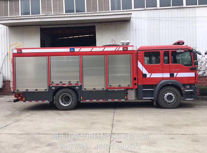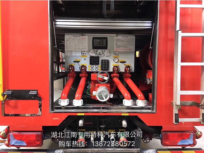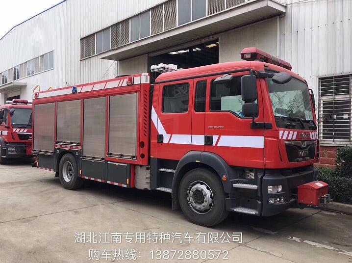 JDF5160GXFAP40型壓縮空氣泡沫消防車,采用德國曼恩商用車股份公司生產的TGM18.290消防車底盤改裝而成。整車由消防員乘員室和車身兩大部分組成,乘員室為原裝雙排駕駛室,可乘坐2+4人,該車為內藏罐結構,車身前部為器材箱,中部為水罐,水罐兩側為器材箱,后部為泵房。載液罐體為304不銹鋼,與底盤采用彈性連接,載水3000kg,泡沫液量1000kg,裝備了德國邁凱生產的MicroCAFS3000型消防車用壓縮空氣泡沫系統,額定壓縮空氣泡沫流量50L/S,可支持8支400L/min流量的CAFS泡沫槍同時作戰;沿消防樓梯往上鋪設380M水帶,支持2支400L/min流量的水槍使用CAFS同時滅火作戰,末端槍口壓力5bar。廣泛應用于地下、石油、化工、大型商場、高層住宅、重點文物、車站碼頭等。特別節省水和泡沫液,高效環保,而且不會造成二次傷害。該系統操作簡單,免維護,一鍵即可出CAFS,使用完后無需對泡沫泵進行清洗。