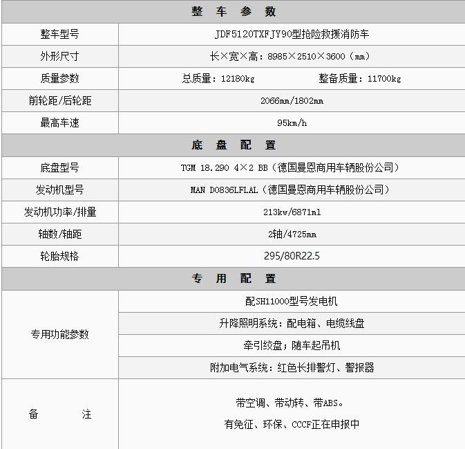 JDF5120TXFJY90搶險救援消防車是我公司應用新技術、新工藝,自主研制開發(fā)的具有自主知識產權的最新產品。該車系選用德國曼恩商用車輛股份公司生產的TGM18.290二類汽車底盤改裝而成,原裝雙排駕駛室,可載含駕駛員在內的乘員6人,駕乘舒適輕便。 在引進國外最先進的技術基礎上,結合國內外搶險特點進行創(chuàng)新開發(fā)設計,根據用戶需要可配備有偵檢類、警戒類、救生類、破拆類、照明類、個人防護類各種搶險救援器材。器材安裝在抽拉拖板、立式抽拉、旋轉拉架上。整車線型流暢、外觀新穎、美觀大方、器材布置合理緊湊、取拿方便,是消防部隊和企業(yè)進行搶險救援領域的好幫手。該車主要用于大中城市、人口稠密地方搶險救援工作。搶險救援消防車裝備到公安消防部隊,增強了部隊的戰(zhàn)斗力,為消防部隊的正規(guī)化、現代化建設作出積極的貢獻。