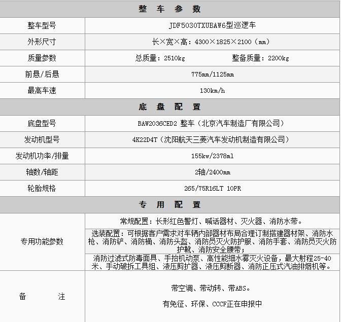 江特牌JDF5030TXUBAW6型巡邏車采用北京汽車制造廠有限公司牌BAW2036CED2 型輕型越野汽車改裝而成,此車具有越野性能強、靈活機動、通過性大等優勢,無論是在鄉村小路、狹窄的街道、崎嶇的山路、雨天濕滑路面或陡坡等復雜地形,只要有能讓車身進出的空間就能快速、靈活地進行滅火救援,突發火災險情時可搭載4人形成戰斗小組消滅火源。該車廣泛適用于森林路況、廠礦、碼頭、校園、小區等人流密集區域的突發火情前期處置。