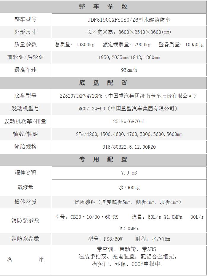 江特牌JDF5190GXFSG80/Z6型水罐消防車采用重汽豪沃ZZ5207TXFV471GF5底盤改裝而成。整車由消防員乘員室和車身兩大部分組成,乘員室為原裝雙排,可乘坐2+4人,該車為外露罐結構,車身前部為器材箱,中部為罐體,后部為泵房。載液罐體為優質碳鋼,內部噴涂環氧底漆及環氧瀝青漆,與底盤采用彈性連接,載水量7900kg,裝備了上海茸申消防設備有限公司生產CB20.10/30.60-RS型中低壓消防泵,額定流量60L/S,車頂安裝成都威斯特消防機械有限公司生產的PS8/60W型車用消防炮。該車最大的特點是載液量大、操控性好、維修簡便。可廣泛應用于公安消防隊、廠礦企業及社區、碼頭等場所,撲救大型油類火災和一般物質火災。