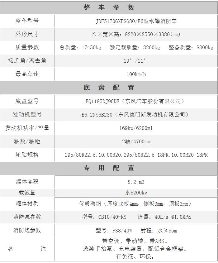 江特牌JDF5170GXFSG80/E6型水罐消防車采用東風EQ1185DJ9CDF底盤改裝而成。整車由消防員乘員室和車身兩大部分組成,乘員室為原裝雙排,可乘坐3+3人,該車為內藏罐結構,車身兩側為器材箱,中部為罐體,后部為泵房。載液罐體為優質碳鋼,內部噴涂環氧底漆及環氧瀝青漆,與底盤采用彈性連接,載水量8200kg,裝備了上海茸申消防設備有限公司生產CB10/40-RS型常壓消防泵,額定流量40L/S,車頂安裝成都威斯特消防機械有限公司生產的PS8/40W型車用消防炮。該車最大的特點是載液量大、操控性好、維修簡便。可廣泛應用于公安消防隊、廠礦企業及社區、碼頭等場所,撲救大型油類火災和一般物質火災。