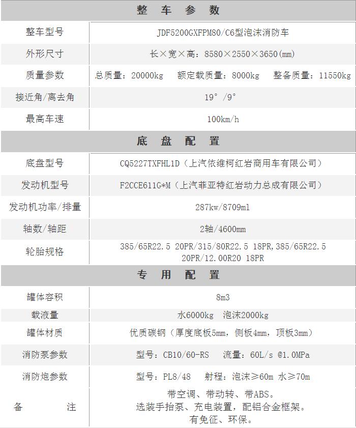 江特牌JDF5200GXFPM80/C6型泡沫消防車采用上汽依維柯紅巖商用車有限公司生產的CQ5227TXFHL1D底盤改裝而成。整車由消防員乘員室和車身兩大部分組成,乘員室為原裝雙排,可乘坐2+4人,該車為外露罐結構,中部為罐體,后部為泵房。載液罐體為優質碳鋼,內部噴涂環氧底漆及環氧瀝青漆,與底盤采用彈性連接,載水量6000kg,泡沫液量2000kg,裝備了上海茸申消防設備有限公司生產CB10/60-RS型常壓消防泵,額定流量60L/S,車頂安裝成都威斯特消防機械有限公司生產的PL8/48型車用消防炮。該車最大的特點是載液量大、操控性好、維修簡便。可廣泛應用于公安消防隊、廠礦企業及社區、碼頭等場所,撲救大型油類火災和一般物質火災。
