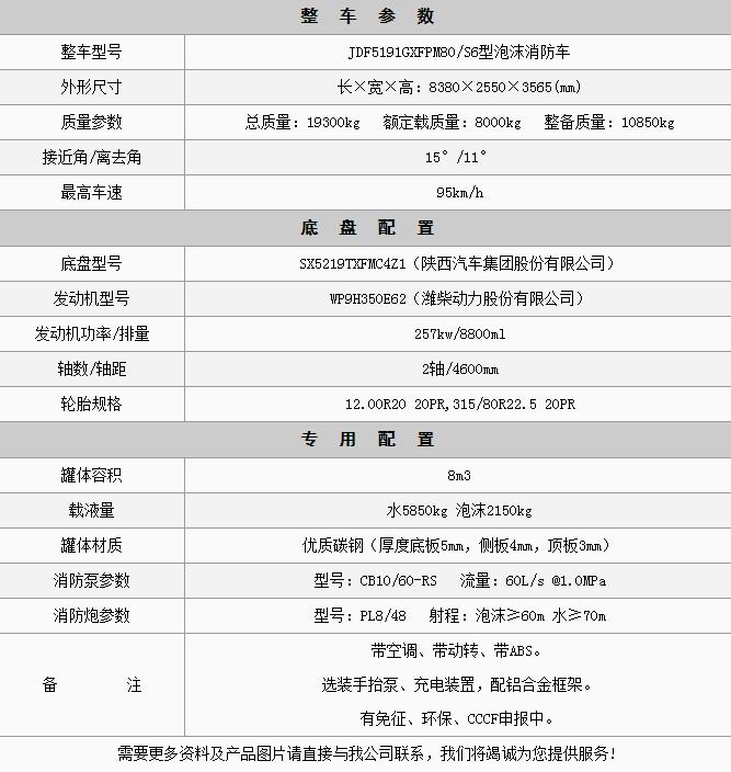 江特牌JDF5191GXFPM80/S6型泡沫消防車采用陜西汽車集團股份有限公司生產的SX5219TXFMC4Z型消防車二類底盤改裝而成的消防用車。整車由消防員乘員室和車身兩大部分組成,乘員室為單排改雙排,可乘坐2+4人,該車為外露罐結構,車身前部為器材箱,中部為罐體,后部為泵房。載液罐體為優質碳鋼,內部噴涂環氧底漆及環氧瀝青漆,與底盤采用彈性連接,載水量5850g,泡沫液量2150kg,裝備了上海茸申消防設備有限公司生產CB10/60-RS型常壓消防泵,額定流量60L/S,車頂安裝成都威斯特消防機械有限公司生產的PL8/48型車用消防炮。該車最大的特點是載液量大、操控性好、維修簡便?蓮V泛應用于公安消防隊、廠礦企業及社區、碼頭等場所,撲救大型油類火災和一般物質火災。
