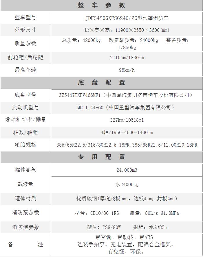 江特牌JDF5420GXFSG240/Z6型水罐消防車采用重汽豪沃ZZ5447TXFV466MF1底盤改裝而成。整車由消防員乘員室和車身兩大部分組成,乘員室為原裝單排,可乘坐2人,該車為外露罐結構,中部為罐體,后部為泵房。載液罐體為優質碳鋼,內部噴涂環氧底漆及環氧瀝青漆,與底盤采用彈性連接,載水量24000kg,裝備了上海茸申消防設備有限公司生產CB10/80-1RS型常壓消防泵,額定流量80L/S,車頂安裝成都威斯特消防機械有限公司生產的PS8/80W型車用消防炮。該車最大的特點是載液量大、操控性好、維修簡便。可廣泛應用于公安消防隊、廠礦企業及社區、碼頭等場所,撲救大型油類火災和一般物質火災。