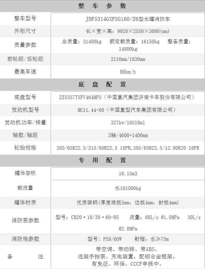 江特牌JDF5314GXFSG160/Z6型水罐消防車采用重汽豪沃ZZ5357TXFV464MF5底盤改裝而成。整車由消防員乘員室和車身兩大部分組成,乘員室為原裝雙排,可乘坐2+4人,該車為外露罐結構,車身前部為器材箱,中部為罐體,后部為泵房。載液罐體為優質碳鋼,內部噴涂環氧底漆及環氧瀝青漆,與底盤采用彈性連接,載水量161500kg,裝備了上海茸申消防設備有限公司生產CB20·10/30·60-RS型中低壓消防泵,額定流量60L/S,車頂安裝成都威斯特消防機械有限公司生產的PS8/60W型車用消防炮。該車最大的特點是載液量大、操控性好、維修簡便。可廣泛應用于公安消防隊、廠礦企業及社區、碼頭等場所,撲救大型油類火災和一般物質火災。