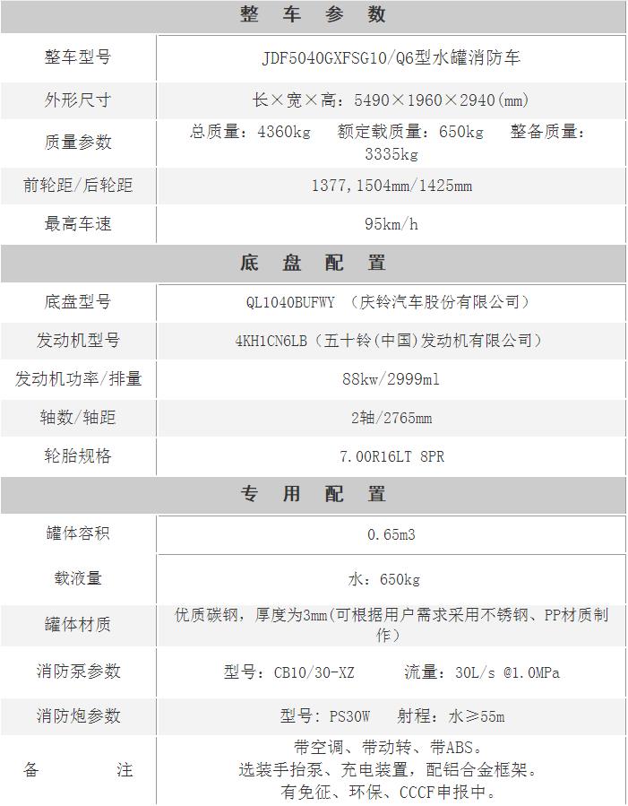 江特牌JDF5040GXFSG10/Q6型水罐消防車,采用慶鈴QL1040BUFWY底盤改裝而成。整車由消防員乘員室和車身兩大部分組成,乘員室為原裝雙排,可乘坐2+3人,該車為內藏罐結構,車身前部為水罐+器材箱,后部為泵房。載液罐體為優質碳鋼,與底盤采用彈性連接,載水650kg,裝備了上海雄真消防設備有限公司生產CB10/30-XZ型消防泵,額定流量30L/S,車頂安裝成都威斯特消防機械有限公司生產的PS30W型車用消防炮。該車輛結構緊湊,配置完備,機動性強,能夠及時應對企業,社區或重點消防單位的火情,可以第一時間形成小型戰斗力進行初期火災的撲救和人員疏散撤離。可廣泛應用于消防救援站,政府專職消防隊,企業專職消防隊等。