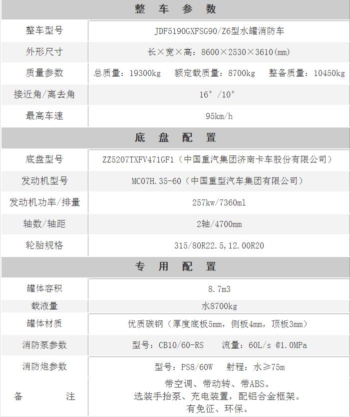 江特牌JDF5190GXFSG90/Z6型水罐消防車采用重汽豪沃ZZ5207TXFV471GF1底盤改裝而成。整車由消防員乘員室和車身兩大部分組成,乘員室為原裝單排,可乘坐2人,該車為T罐結(jié)構(gòu),車身前部為器材箱,中部為罐體,后部為泵房。載液罐體為優(yōu)質(zhì)碳鋼,內(nèi)部噴涂環(huán)氧底漆及環(huán)氧瀝青漆,與底盤采用彈性連接,載水量8700kg,裝備了上海茸申消防設(shè)備有限公司生產(chǎn)CB10/60-RS型常壓消防泵,額定流量60L/S,車頂安裝成都威斯特消防機(jī)械有限公司生產(chǎn)的PS8/60W型車用消防炮。該車最大的特點(diǎn)是載液量大、操控性好、維修簡(jiǎn)便。可廣泛應(yīng)用于公安消防隊(duì)、廠礦企業(yè)及社區(qū)、碼頭等場(chǎng)所,撲救大型油類火災(zāi)和一般物質(zhì)火災(zāi)。