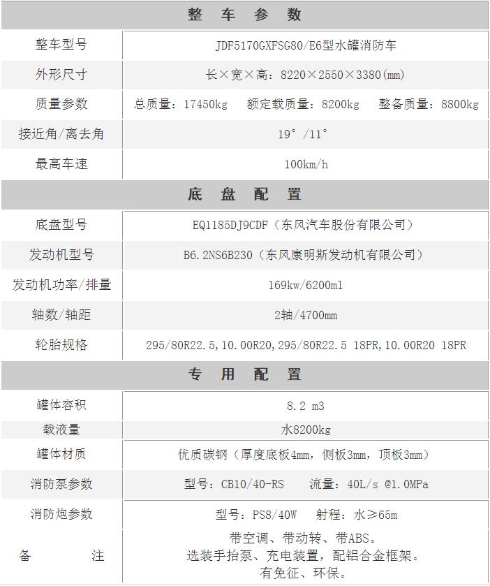江特牌JDF5170GXFSG80/E6型水罐消防車采用東風EQ1185DJ9CDF底盤改裝而成。整車由消防員乘員室和車身兩大部分組成,乘員室為原裝雙排,可乘坐3+3人,該車為內藏罐結構,車身兩側為器材箱,中部為罐體,后部為泵房。載液罐體為優質碳鋼,內部噴涂環氧底漆及環氧瀝青漆,與底盤采用彈性連接,載水量8200kg,裝備了上海茸申消防設備有限公司生產CB10/40-RS型常壓消防泵,額定流量40L/S,車頂安裝成都威斯特消防機械有限公司生產的PS8/40W型車用消防炮。該車最大的特點是載液量大、操控性好、維修簡便?蓮V泛應用于公安消防隊、廠礦企業及社區、碼頭等場所,撲救大型油類火災和一般物質火災。