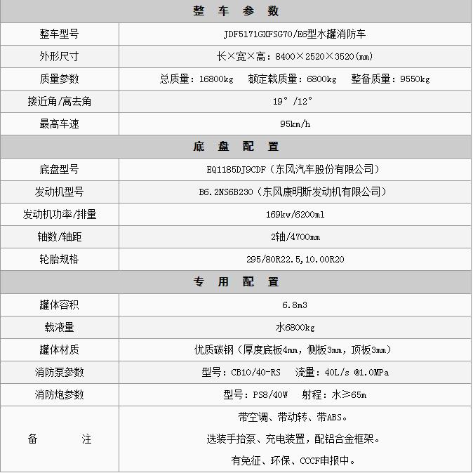 江特牌JDF5171GXFSG70/E6型水罐消防車采用東風EQ1185DJ9CDF底盤改裝而成。整車由消防員乘員室和車身兩大部分組成,乘員室為原裝雙排,可乘坐3+3人,該車為內藏罐結構,車身兩側為器材箱,中部為罐體,后部為泵房。載液罐體為優質碳鋼,內部噴涂環氧底漆及環氧瀝青漆,與底盤采用彈性連接,載水量6800kg,裝備了上海茸申消防設備有限公司生產CB10/40-RS型常壓消防泵,額定流量40L/S,車頂安裝成都威斯特消防機械有限公司生產的PS8/40W型車用消防炮。該車最大的特點是載液量大、操控性好、維修簡便。可廣泛應用于公安消防隊、廠礦企業及社區、碼頭等場所,撲救大型油類火災和一般物質火災。