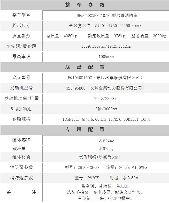 江特牌JDF5040GXFSG10/E6型水罐消防車,采用東風EQ1040D16DC底盤改裝而成。整車由消防員乘員室和車身兩大部分組成,乘員室為原裝雙排,可乘坐2+3人,該車為外露罐結構,車身前部為水罐,后部為泵房。載液罐體為優質碳鋼,與底盤采用螺栓連接,載水975kg,裝備了上海雄真消防設備有限公司生產CB10/20-XZ型消防泵,額定流量20L/S,車頂安裝成都威斯特消防機械有限公司生產的PS20W型車用消防炮。該車輛結構緊湊,配置完備,機動性強,能夠及時應對企業,社區或重點消防單位的火情,可以第一時間形成小型戰斗力進行初期火災的撲救和人員疏散撤離。可廣泛應用于消防救援站,政府專職消防隊,企業專職消防隊等。