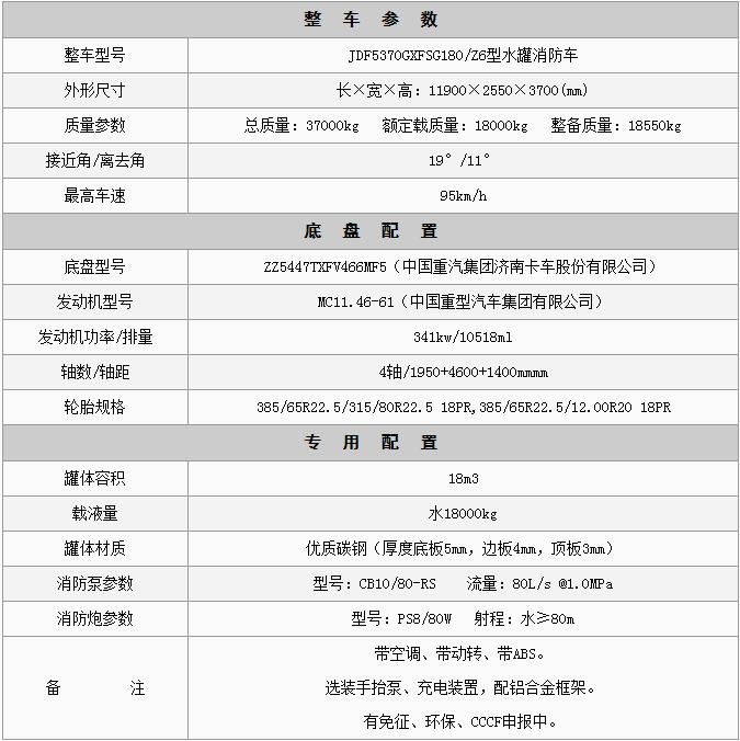 江特牌JDF5370GXFSG180/Z6型水罐消防車采用中國重汽集團濟南卡車股份有限公司生產的ZZ5447TXFV466MF5底盤改裝而成。整車由消防員乘員室和車身兩大部分組成,乘員室為原裝雙排,可乘坐2+4人,該車為外露罐結構,車身前部為器材箱,中部為罐體,后部為泵房。載液罐體為優質碳鋼,內部噴涂環氧底漆及環氧瀝青漆,與底盤采用彈性連接,載水量18000kg,裝備了上海茸申消防設備有限公司生產的CB10/80-RS型常壓消防泵,額定流量80L/S,車頂安裝成都威斯特消防機械有限公司生產的PS8/80W型車用消防炮。該車最大的特點是載液量大、操控性好、維修簡便。可廣泛應用于公安消防隊、廠礦企業及社區、碼頭等場所,撲救大型油類火災和一般物質火災。