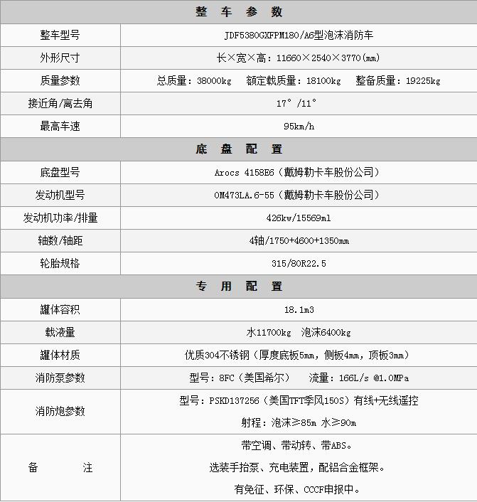 江特牌JDF5380GXFPM180/A6型泡沫消防車采用戴姆勒卡車股份公司生產的Arocs 4158E6 8×4 二類底盤改裝而成。整車由消防員乘員室和車身兩大部分組成,乘員室為單排,可乘坐2人,該車為外露罐結構,中部為罐體,后部為泵房。載液罐體為優質304不銹鋼,內部噴涂環氧底漆及環氧瀝青漆,與底盤采用彈性連接,載水量11700kg,泡沫液量6400kg,裝備了美國希爾8FC型消防泵,額定流量166L/S,車頂安裝美國TFT季風150S PSKD137256型車用消防炮。該車最大的特點是載液量大、操控性好、維修簡便?蓮V泛應用于公安消防隊、廠礦企業及社區、碼頭等場所,撲救大型油類火災和一般物質火災。