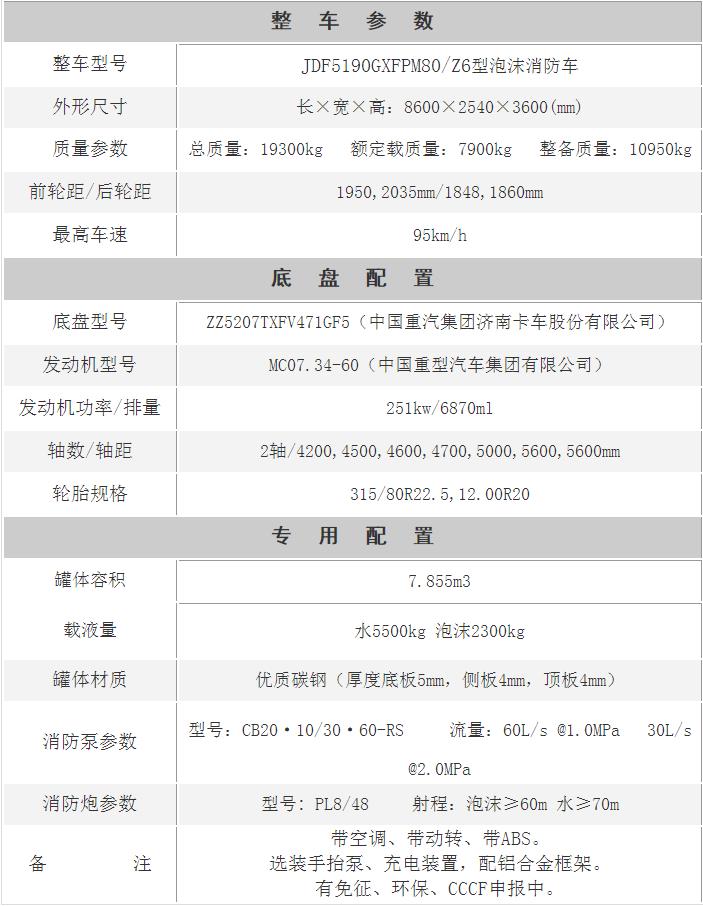 江特牌JDF5190GXFPM80/Z6型泡沫消防車采用重汽豪沃ZZ5207TXFV471GF5底盤改裝而成。整車由消防員乘員室和車身兩大部分組成,乘員室為原裝雙排,可乘坐2+4人,該車為外露罐結構,車身前部為器材箱,中部為罐體,后部為泵房。載液罐體為優質碳鋼,內部噴涂環氧底漆及環氧瀝青漆,與底盤采用彈性連接,載水量5500kg,泡沫液量2300kg,裝備了上海茸申消防設備有限公司生產CB20.10/30.60-RS型中低壓消防泵,額定流量60L/S,車頂安裝成都威斯特消防機械有限公司生產的PL8/48型車用消防炮。該車最大的特點是載液量大、操控性好、維修簡便。可廣泛應用于公安消防隊、廠礦企業及社區、碼頭等場所,撲救大型油類火災和一般物質火災。