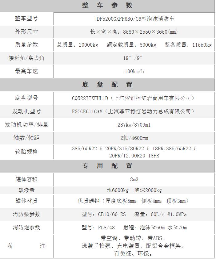 江特牌JDF5200GXFPM80/C6型泡沫消防車采用上汽依維柯紅巖商用車有限公司生產的CQ5227TXFHL1D底盤改裝而成。整車由消防員乘員室和車身兩大部分組成,乘員室為原裝雙排,可乘坐2+4人,該車為外露罐結構,中部為罐體,后部為泵房。載液罐體為優質碳鋼,內部噴涂環氧底漆及環氧瀝青漆,與底盤采用彈性連接,載水量6000kg,泡沫液量2000kg,裝備了上海茸申消防設備有限公司生產CB10/60-RS型常壓消防泵,額定流量60L/S,車頂安裝成都威斯特消防機械有限公司生產的PL8/48型車用消防炮。該車最大的特點是載液量大、操控性好、維修簡便。可廣泛應用于公安消防隊、廠礦企業及社區、碼頭等場所,撲救大型油類火災和一般物質火災。
