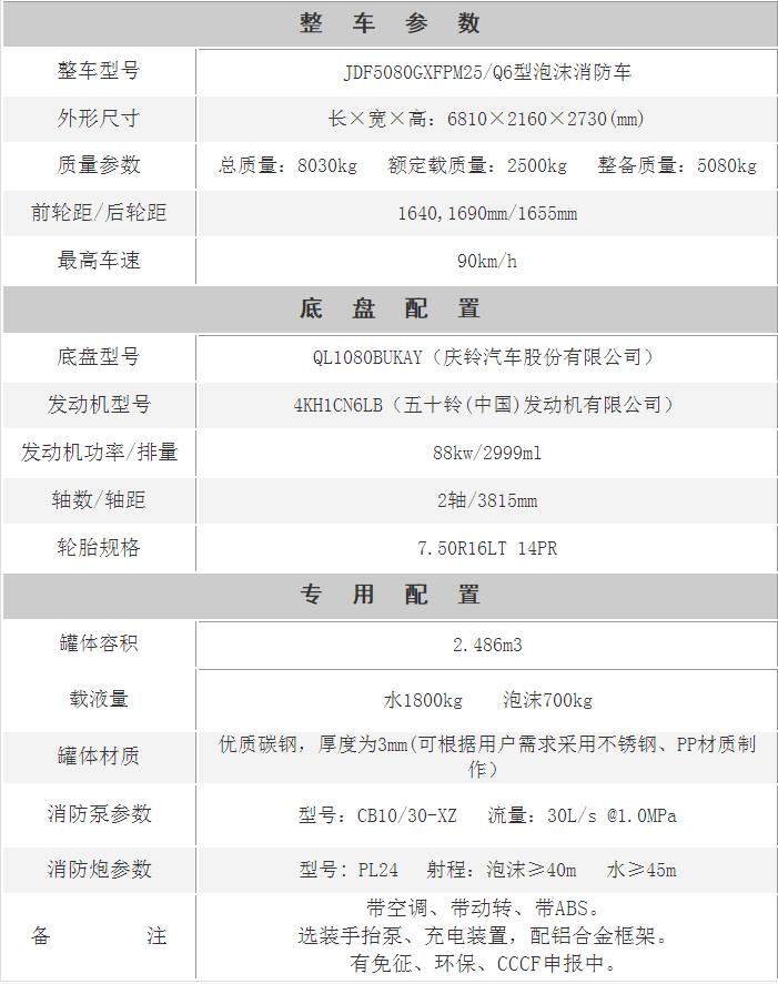 江特牌JDF5080GXFPM25/Q6型泡沫消防車,采用慶鈴QL1080BUKAY底盤改裝而成。整車由消防員乘員室和車身兩大部分組成,乘員室為雙排,可乘坐3+3人,該車為內藏罐結構,車身兩側為器材箱,中間為水罐,后部為泵房。載液罐體為優質碳鋼,與底盤采用彈性連接,載水1800kg,泡沫液量700kg,裝備了上海雄真消防設備有限公司生產CB10/30型低壓消防泵,額定流量30L/S,車頂安裝成都威斯特消防機械有限公司生產的PL24型車用消防炮。該車輛結構緊湊,配置完備,機動性強,能夠及時應對企業,社區或重點消防單位的火情,可以第一時間形成小型戰斗力進行初期火災的撲救和人員疏散撤離。可廣泛應用于消防救援站,政府專職消防隊,企業專職消防隊等。