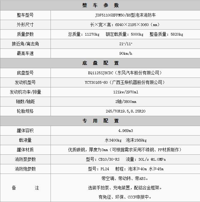 江特牌JDF5110GXFPM50/E6型泡沫消防車采用東風EQ1125SJ8CDC底盤改裝而成。整車由消防員乘員室和車身兩大部分組成,乘員室為雙排,可乘坐3+3人,該車為外露罐結(jié)構(gòu),車身前部為器材箱,中部為水罐,后部為泵房。載液罐體為優(yōu)質(zhì)碳鋼,與底盤采用彈性連接,載水量3400kg,泡沫液量1569kg,裝備了上海茸申消防設(shè)備有限公司生產(chǎn)CB10/30-RS型低壓消防泵,額定流量30L/S,車頂安裝成都威斯特消防機械有限公司生產(chǎn)的PL24型車用消防炮。該車輛結(jié)構(gòu)緊湊,配置完備,機動性強,能夠及時應(yīng)對企業(yè),社區(qū)或重點消防單位的火情,可以第一時間形成小型戰(zhàn)斗力進行初期火災(zāi)的撲救和人員疏散撤離。可廣泛應(yīng)用于消防救援站,政府專職消防隊,企業(yè)專職消防隊等。