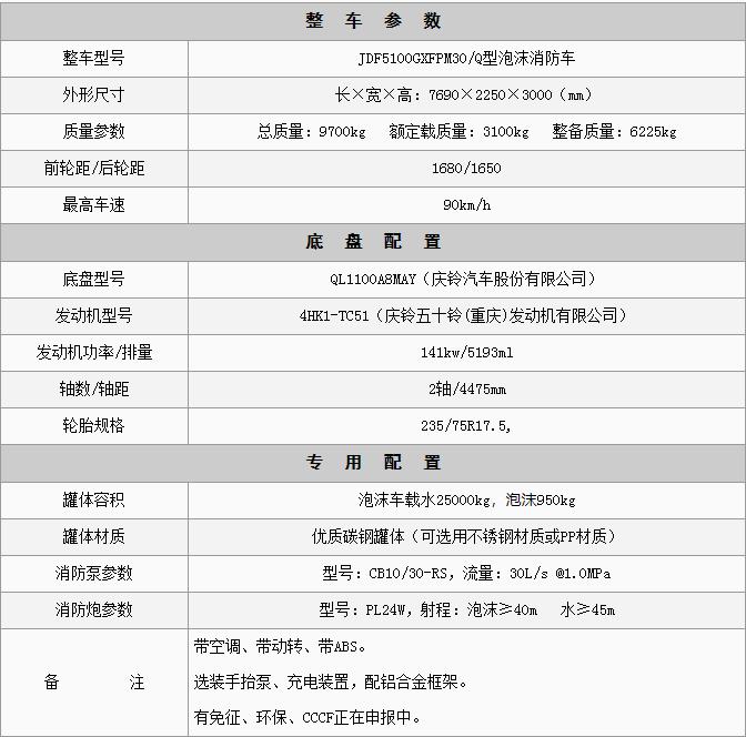 JDF5100GXFPM30/Q型泡沫消防車,采用慶鈴QL1100A8MAY底盤改裝而成。整車由消防員乘員室和車身兩大部分組成,乘員室為單排改雙排,可乘坐2+3人,該車為內(nèi)藏罐結(jié)構(gòu),車身前部為器材箱,中部為水罐,后部為泵房。載液罐體為優(yōu)質(zhì)碳鋼,與底盤采用彈性連接,載水2500kg,泡沫液量1000kg,裝備了上海茸申消防設(shè)備有限公司生產(chǎn)CB10/30型低壓消防泵,額定流量30L/S,車頂安裝成都威斯特消防機(jī)械有限公司生產(chǎn)的PL24型車用消防炮。該車最大的特點(diǎn)是載液量大、操控性好、維修簡(jiǎn)便。可廣泛應(yīng)用于公安消防隊(duì)、廠礦企業(yè)及社區(qū)、碼頭等場(chǎng)所,撲救大型油類火災(zāi)或一般物質(zhì)火災(zāi)。