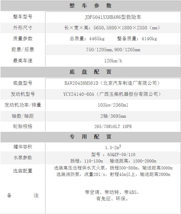 江特牌JDF5041XXHBAW6型救險車采用北京汽車制造廠有限公司牌BAW2043HMS61D型輕型越野汽車改裝而成,該車主要用于突發自然災害、突發安全事故或火災等應急搶險保障。車內設計有專用器材架,車頂設計有設備平臺,可根據實際使用需要配置各種應急救援裝備或專用工具、設備器具。廣泛適用于軍隊、公安特勤、醫療衛生部門的自然災害搶險、消防救援;以及石油、化工、天然氣、供水供電等管道的檢測與搶修;還可運用于高壓輸變電線路、高速公路、礦山等設備故障的搶修維護等多種用途。