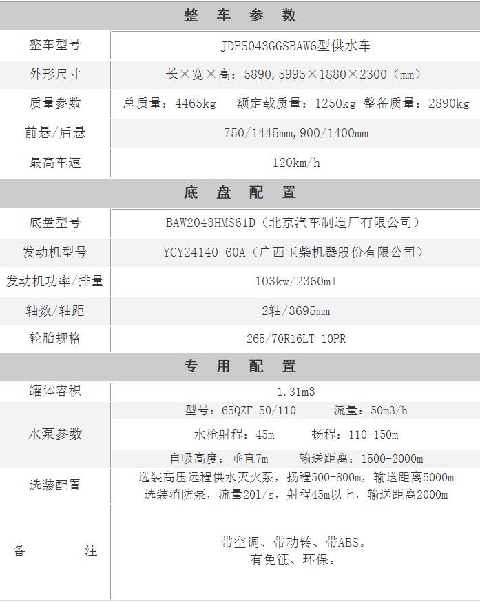 江特牌JDF5043GGSBAW6型供水車采用北京汽車制造廠有限公司生產的BAW2043HMS61D型輕型二類越野底盤改裝而成,該車最大的特點就是機動靈活、速度快、操控性好、駕駛舒適,越野性能強,可廣泛應用于在丘陵、山地、凹地、河谷、森林等地帶巡邏,及時發現火情,撲滅小型火災。