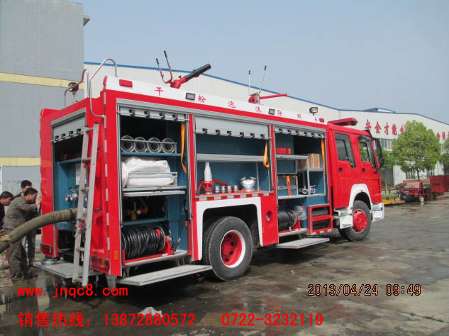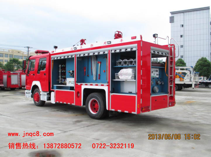 由湖北江南消防車廠生產的泡沫干粉聯用消防車由東風153底盤或豪濼底盤制作而成,以下是泡沫干粉消防車簡介: