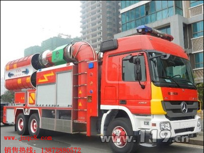 正負壓排煙消防車外形穩重、新穎、大方,尾部裝有6個桶裝排風口,分為兩排,價值341萬元。一旦全部開啟排風口,最大排風量800000立方每小時,細水霧噴射最遠距離大于80米,正壓連接排煙管時最遠送風距離不小于500米,負壓連接排煙管時最遠抽風距離大于300米,風暴排煙裝置可上下升降、360度旋轉。