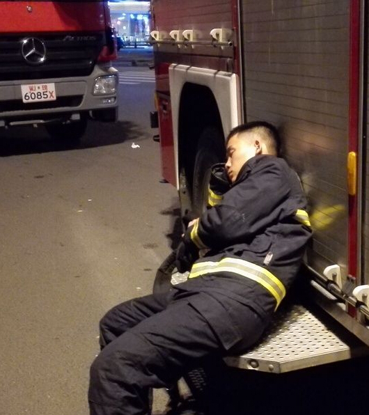 小編趕到事發現場,只見幾十名消防兵依在消防車旁邊睡著了,有的甚至坐在柱子上都已經瞇著了,附近居民見到這些情景,不禁豎著大拇指“消防兵是最可愛的人”。