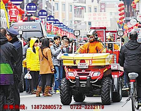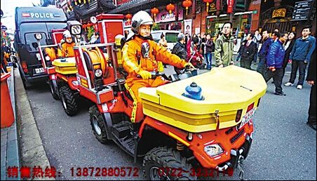 昨日,上海城隍廟一排消防摩托車引來市圍觀,七輛消防摩托車緩慢的在街上巡邏,這種四輪消防摩托車載水量1噸,帶高壓炮和卷盤,最大的特點是小巧靈活,很多狹窄街道均可以進入。消防摩托車代替了消防車的使用,大大緩解了消防壓力。