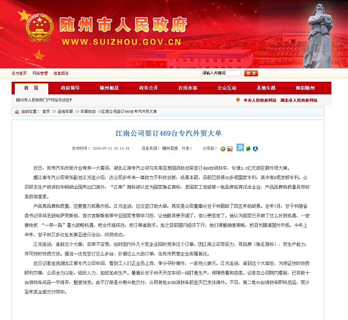 我公司湖北江南專用特種汽車有限公司自去年簽定的出口至菲律賓469臺消防車外貿(mào)大單,公司不停的為此訂單忙碌應(yīng)戰(zhàn),也有不少媒體爭相報道。以下是隨州市權(quán)威機(jī)構(gòu)隨州市人民政府發(fā)出的報道: