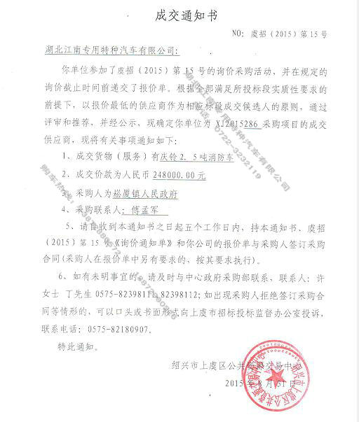 北江南專用特種汽車有限公司參加浙江省紹興市上虞區崧廈鎮人民政府慶鈴2.5噸消防車的招標工作,于8月31日公布中標,以下是中標通知書。