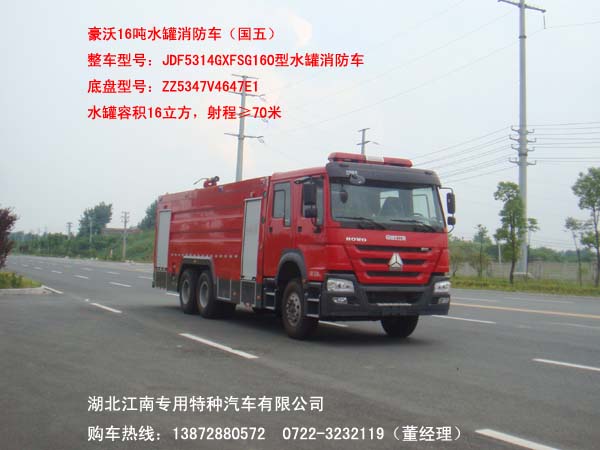 豪沃16噸水罐消防車(國五)采用中國重汽豪沃ZZ5347V4647E1原廠正裝國五標(biāo)準(zhǔn)底盤,水罐容積12-16立方,采用CB10/60型消防泵(可選裝CB20.10/30.60型中低壓消防泵),PS50W型消防炮,射程≥70米,廠家電話:13872880572 豪沃消防車采用340馬力發(fā)動(dòng)機(jī),具有動(dòng)力強(qiáng)勁、底盤扎實(shí)耐用、機(jī)動(dòng)性強(qiáng)、噴灑射程遠(yuǎn)等優(yōu)勢和特點(diǎn),可從天然水源和消防栓直接吸水,向其他消防車輛和消防裝備供水,也可用于缺水地區(qū)輸水供水,適合撲滅一般性火災(zāi),是廠礦企業(yè)、石油化工、森林港口消防隊(duì)、企事業(yè)單位及消防官兵滅火戰(zhàn)斗、搶險(xiǎn)救援的最佳消防車輛。歡迎致電:0722-3232119 13872880572,了解更多豪沃雙橋16噸水罐消防車價(jià)格、豪沃雙橋16噸水罐消防車圖片、豪沃雙橋16噸水罐消防車配置和參數(shù)詳細(xì)資料。
