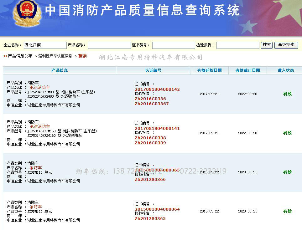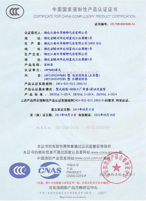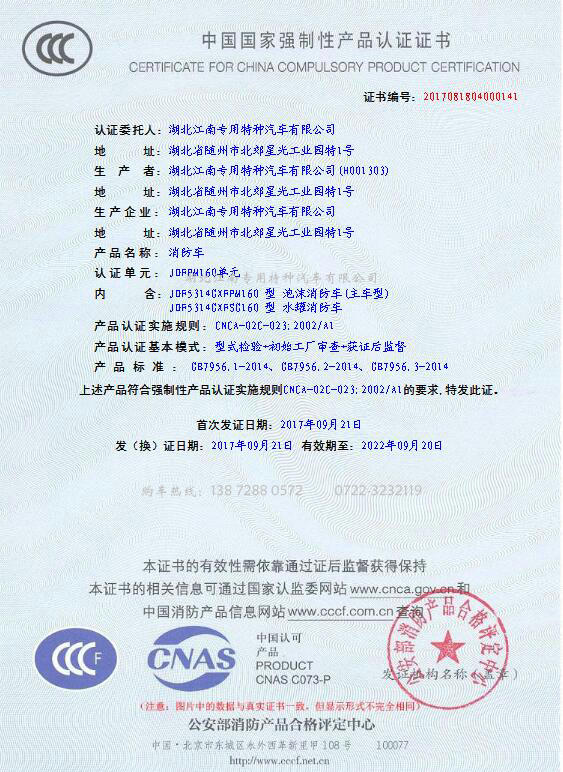 熱烈慶祝本公司湖北江南專用特種汽車有限公司生產的消防車榮獲公安部消防產品合格評定中心頒發的CCC強制性認證證書。湖北江南總機熱線:0722-3232119