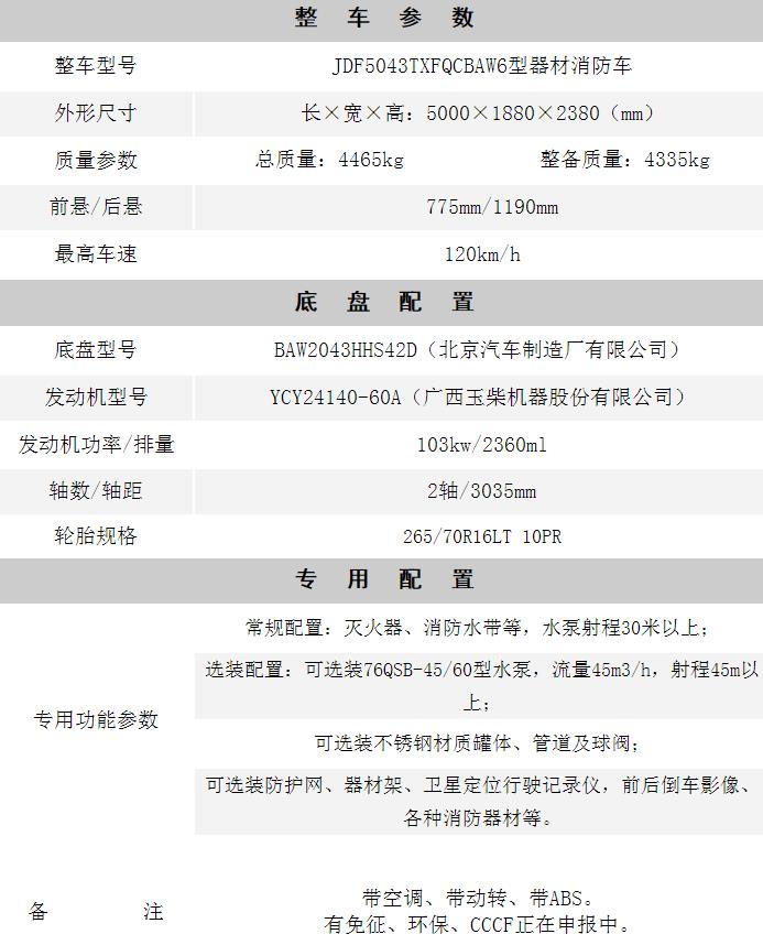 江特牌JDF5043TXFQCBAW6型器材消防車采用北京汽車制造廠有限公司牌BAW2043HHS42D型輕型越野底盤改裝而成,該車可根據客戶需求,對車輛內部器材布局合理訂制搭建,能迅速從各個方向拿取滅火器材,隨車消防器材只要到達現場立即就能投入戰斗;該車具有越野性能強、靈活機動、通過性大等優勢、無論是在鄉村小路、狹窄的街道、崎嶇的山路,只要有能讓車身進出的空間就能快速、靈活地進行滅火救援,突發火災險情時可搭載5人形成戰斗小組消滅火源。主要適用于森林路況、廠礦、碼頭、校園、小區等人流密集區域的突發火情前期處置。