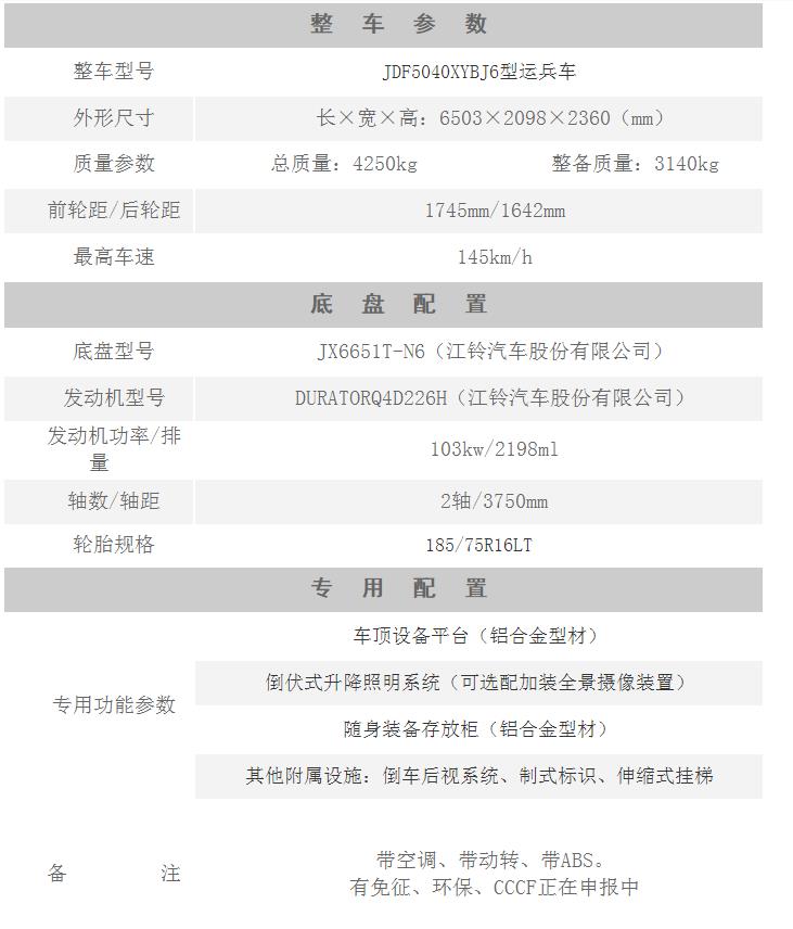 江特牌JDF5040XYBJ6型運兵車,由江鈴福特新世代全順JX6651T-N6型底盤、車頂設備平臺、倒伏式升降照明系統、隨身裝備存放柜、其他附屬設施等組成。整車改裝后載荷分配均勻,質心位置和穩定性計算精確,內部空間布局合理,能滿足操作人員的使用要求。該車專用于突發自然災害、突發安全事故或火災等應急搶險人員輸送。廣泛適用于軍隊、公安特勤、醫療衛生部門的自然災害搶險、消防救援保障;以及石油、化工、天然氣、供水供電等管道的檢測與搶修;還可運用于高壓輸變電線路、高速公路、礦山等設備故障的搶修維護等人員輸送。