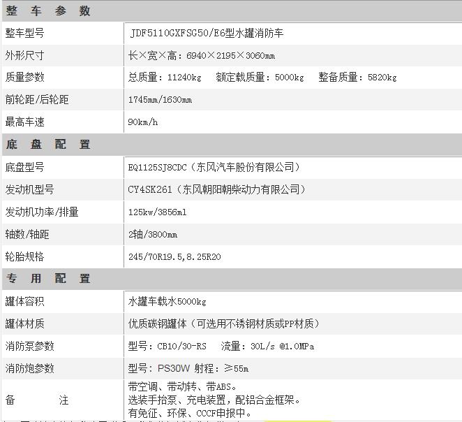 江特牌JDF5110GXFSG50/E6型水罐消防車,采用東風(fēng)EQ1125SJ8CDC底盤改裝而成。整車由消防員乘員室和車身兩大部分組成,乘員室為雙排,可乘坐3+3人,該車為外露罐結(jié)構(gòu),車身前部為器材箱,中部為水罐,后部為泵房。載液罐體為優(yōu)質(zhì)碳鋼,與底盤采用彈性連接,載水5000kg,裝備了上海茸申消防設(shè)備有限公司生產(chǎn)CB10/30型低壓消防泵,額定流量30L/S,車頂安裝成都威斯特消防機(jī)械有限公司生產(chǎn)的PS30W型車用消防炮。該車輛結(jié)構(gòu)緊湊,配置完備,機(jī)動(dòng)性強(qiáng),能夠及時(shí)應(yīng)對(duì)企業(yè),社區(qū)或重點(diǎn)消防單位的火情,可以第一時(shí)間形成小型戰(zhàn)斗力進(jìn)行初期火災(zāi)的撲救和人員疏散撤離。可廣泛應(yīng)用于消防救援站,政府專職消防隊(duì),企業(yè)專職消防隊(duì)等。電話:188 7299 0526