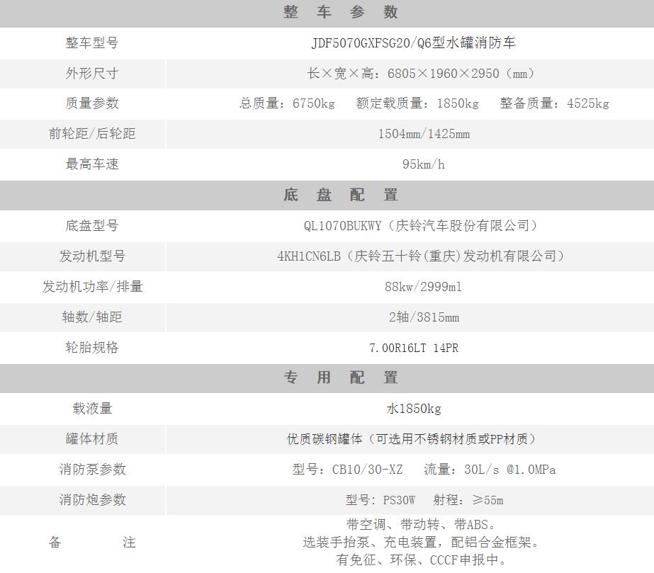 江特牌JDF5070GXFSG20/Q6型水罐消防車,采用慶鈴QL1070BUKWY底盤改裝而成。整車由消防員乘員室和車身兩大部分組成,乘員室為原裝雙排,可乘坐2+3人,該車為內倉罐結構,車身前部為水罐+器材箱,后部為泵房。載液罐體為優質碳鋼,與底盤采用彈性連接,載水1850kg,裝備了上海雄真消防設備有限公司生產CB10/30-XZ型消防泵,額定流量30L/S,車頂安裝成都威斯特消防機械有限公司生產的PS30W型車用消防炮。該車輛結構緊湊,配置完備,機動性強,能夠及時應對企業,社區或重點消防單位的火情,可以第一時間形成小型戰斗力進行初期火災的撲救和人員疏散撤離。可廣泛應用于消防救援站,政府專職消防隊,企業專職消防隊等