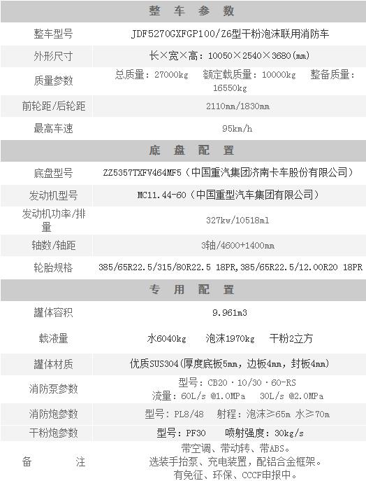 江特牌JDF5270GXFGP100/Z6型干粉泡沫聯用消防車采用重汽豪沃ZZ5357TXFV464MF5底盤改裝而成。整車由消防員乘員室和車身兩大部分組成,乘員室為原裝雙排,可乘坐2+4人,該車為外露罐結構,車身前部為器材箱(干粉罐,氮氣瓶,干粉系統),中部為罐體,后部為泵房。載液罐體為優質碳鋼,內部噴涂環氧底漆及環氧瀝青漆,與底盤采用彈性連接,載水6040kg,泡沫液量1970kg,裝備了上海茸申消防設備有限公司生產CB20·10/30·60-RS型中低壓消防泵,額定流量60L/S,車頂安裝成都威斯特消防機械有限公司生產的PL8/48型車用消防炮和PF30干粉炮。該車最大的特點是載液量大、操控性好、維修簡便?蓮V泛應用于公安消防隊、廠礦企業及社區、碼頭等場所,撲救大型油類火災和一般物質火災。