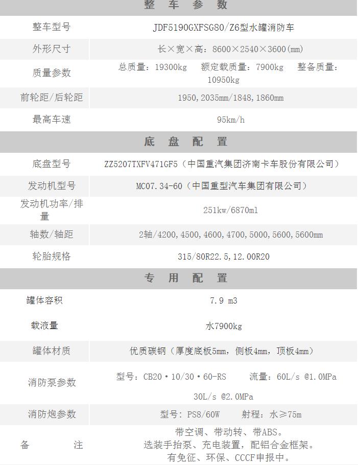 江特牌JDF5190GXFSG80/Z6型水罐消防車采用重汽豪沃ZZ5207TXFV471GF5底盤改裝而成。整車由消防員乘員室和車身兩大部分組成,乘員室為原裝雙排,可乘坐2+4人,該車為外露罐結構,車身前部為器材箱,中部為罐體,后部為泵房。載液罐體為優質碳鋼,內部噴涂環氧底漆及環氧瀝青漆,與底盤采用彈性連接,載水量7900kg,裝備了上海茸申消防設備有限公司生產CB20.10/30.60-RS型中低壓消防泵,額定流量60L/S,車頂安裝成都威斯特消防機械有限公司生產的PS8/60W型車用消防炮。該車最大的特點是載液量大、操控性好、維修簡便?蓮V泛應用于公安消防隊、廠礦企業及社區、碼頭等場所,撲救大型油類火災和一般物質火災。