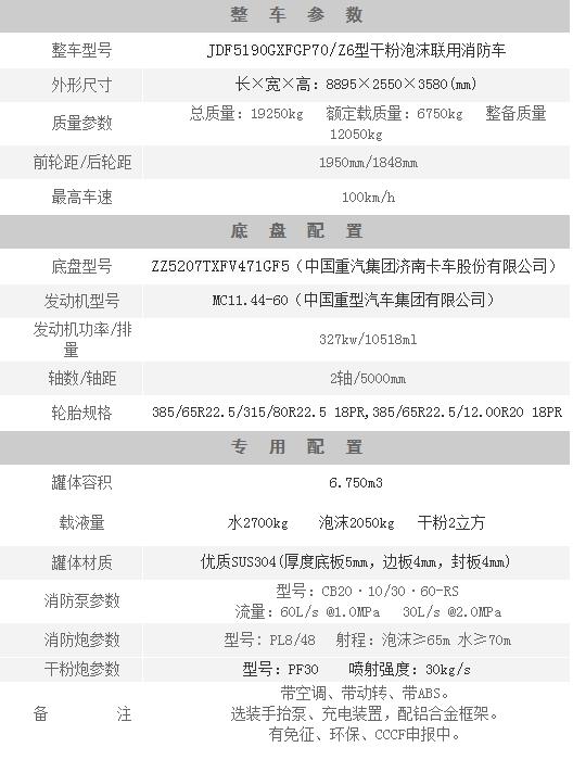 江特牌JDF5190GXFGP70/Z6型干粉泡沫聯用消防車采用重汽豪沃ZZ5207TXFV471GF5底盤改裝而成。整車由消防員乘員室和車身兩大部分組成,乘員室為原裝雙排,可乘坐2+4人,該車為外露罐結構,車身前部為器材箱(干粉罐,氮氣瓶,干粉系統),中部為罐體,后部為泵房。載液罐體為優質碳鋼,內部噴涂環氧底漆及環氧瀝青漆,與底盤采用彈性連接,載水6040kg,泡沫液量1970kg,裝備了上海茸申消防設備有限公司生產CB20·10/30·60-RS型中低壓消防泵,額定流量60L/S,車頂安裝成都威斯特消防機械有限公司生產的PL8/48型車用消防炮和PF30干粉炮。該車最大的特點是載液量大、操控性好、維修簡便。可廣泛應用于公安消防隊、廠礦企業及社區、碼頭等場所,撲救大型油類火災和一般物質火災。