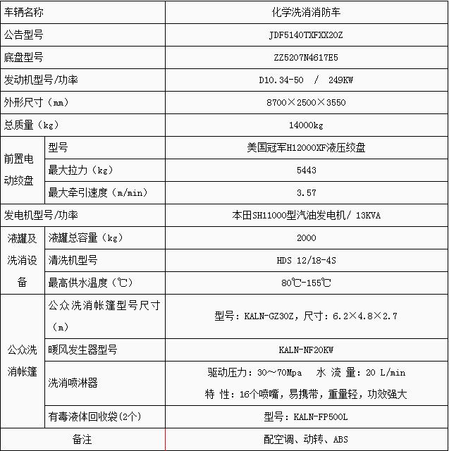 JDF5140TXFXX20Z型化學洗消消防車,采用中國重汽集團濟南卡車股份有限公司生產的ZZ5207N4617E5底盤改裝而成。整車由消防員乘員室和車身兩大部分組成,乘員室為原裝雙排駕駛室,可乘坐2+3人.化學洗消消防車具有滅火、牽引、化學洗消、照明等諸多功能于一體,其性能可靠,功能適用,使用便捷,為救人、處理化學事故以及陸地自然災害提供了良好的救援手段。